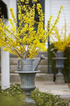 Clip a few branches from a tree that normally buds in the spring. Bring them inside and put them in a vase (or watering can) full of water. The warm air will allow them to bloom quicker. Just set the vase in your outdoor pots when you expect guests!