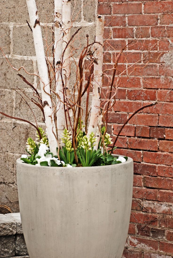 Or, you can plant some cold-hardy flowers like hyacinths or pansies and give them height with some pretty sticks or birch branches.